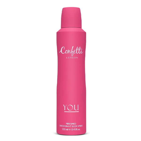 Confetti London Deodorant Body Spray You 250 ml fragrance opens with the zesty notes of bergamot and orange, leading into a floral heart of orange blossom, rose, and jasmine. The scent completes with a base of musk and patchouli, creating an enchanting aura perfect for everyday elegance.